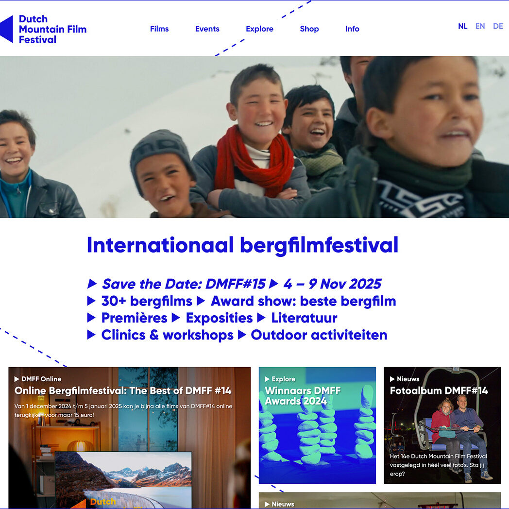 Ook de poster voor de 15e editie van het Dutch Mountain Film Festival mochten wij maken. Een feestelijke koe voor de vijftiende verjaardag van het festival! Tegelijkertijd was het onderste gedeelte van de poster, met de vlaggenlijnen, zo ontworpen dat er makkelijk posters voor deel-events mee konden worden gemaakt.